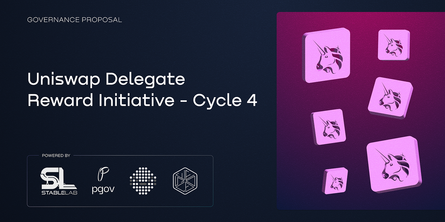 Uniswap governance has approved the continuation of the Delegate Reward Initiative, with applications for Cycle 4 now open. StableLab continues to support governance participation in Uniswap DAO by helping advance this program, which rewards active delegates for their contributions.